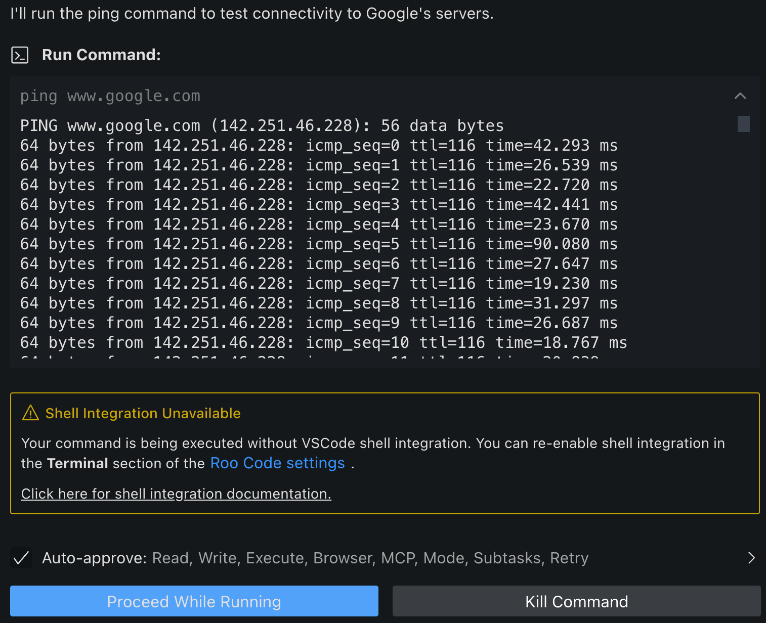 Implemented a fallback mechanism for executing terminal commands if VSCode terminal shell integration fails.
